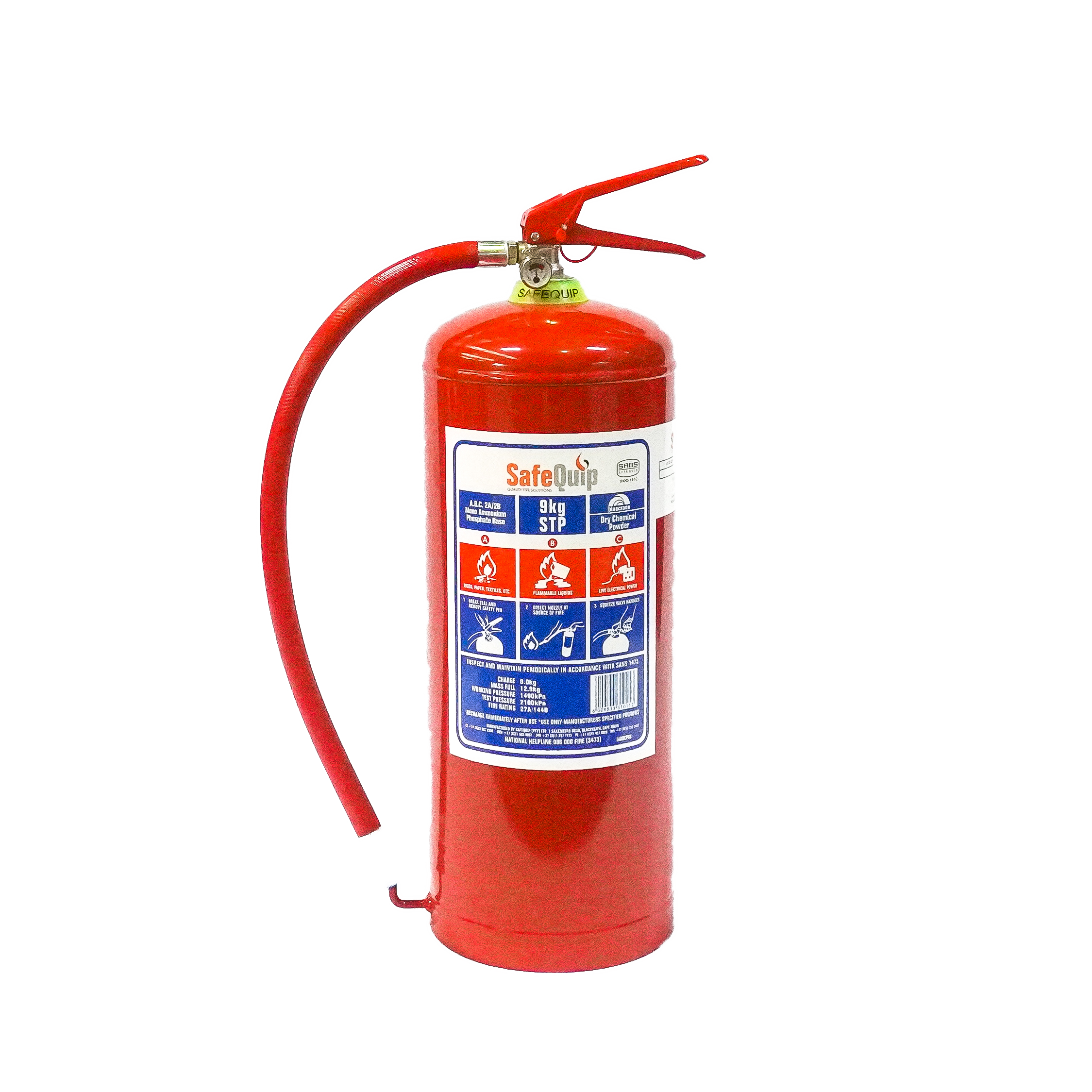 The 9kg DCP STP Fire Extinguisher from the Safequip range is SABS 1910 approved and suitable for Class A, B or C fires, or a combination of these types of fires. Dry Chemical Portable fire extinguishers are the most widely used of all types of fire extinguishers.